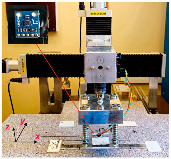 Following path recording, the residual magnetization was measured with an HMC5883L magnetometer (Honeywell, Plymouth, MA, USA) shifted with the positioning system (Figure 4). The magnetometer scanned the recorded magnetization patterns from the sample’s left to the right edge, line by line, parallel to the longitudinal axis. The signal was measured at each 0.5 mm. After one line was scanned to the end, the magnetometer was shifted to another line 1 mm apart along the latitudinal axis. Once the measurement was performed, the samples were subjected to the quasi-static tensile tests.