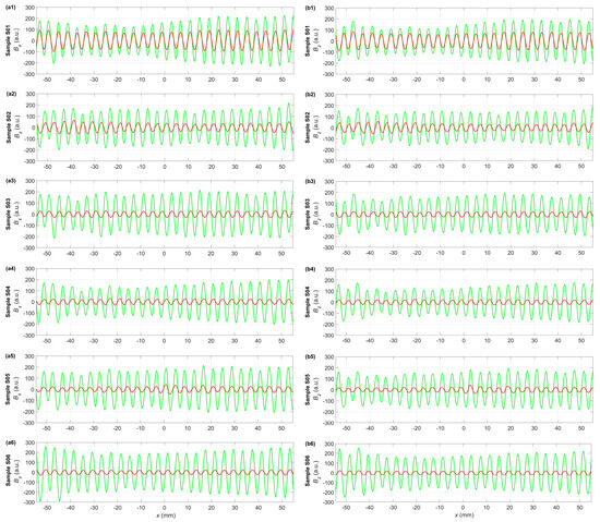 Figure 6 presents changes in the averaged amplitude of the Bx (a1–a6) and Bz (b1–b6) components plotted against the sensor position along the longitudinal axis. The averaged signal before the stress test is green, and the one after the test is red. Independent of the component chosen, the most remarkable feature of the signal after load is that its amplitude decrease corresponds with the increasingly stretched samples. There are no evident frequency variations. The averaged signals in Figure 6 show the amplitude variations caused by the applied stress. For this reason, a more comprehensive analysis is required, including a complete set of the measured signals after preprocessing.