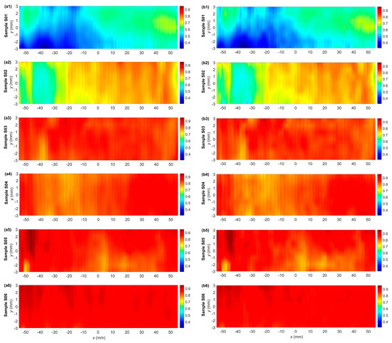The plot of the 2D distribution of relative change in the RMS residual magnetization ΔRMSx (a1–a6) and ΔRMSz (b1–b6) measured in case of samples S01–S06.