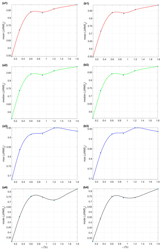 The statistical analysis aims to deliver an unambiguous overview of the general signal trends in the subsequent samples. This study considers four parameters of the ΔRMSx and ΔRMSz, i.e., the mean, median, maximum, and mode. The statistical analysis results for the ΔRMSx are depicted in Figure 8(a1–a4), while for the ΔRMSz, in Figure 8(b1–b4).