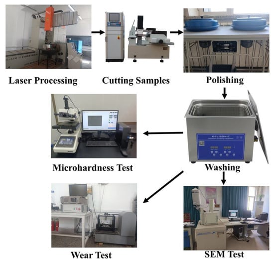The presetting powder method was adopted before the laser cladding experiment, which involves the application of a uniform presetting powder with a thickness of 1 mm on the Ti6Al4V substrate using an organic binder. The powders were placed in a drying stove and dried at 100 °C for 2 h before the experiments. A DL-HL-T200 cross-flow CO2 laser (Shenyang Continental Laser Complete Equipment Co., Ltd., Shenyang, China) was deployed in the experiment, which has a maximum power of 2000 W. Schematic diagram of laser cladding processing can be seen in Figure 3. The experimental parameters are shown in Table 3. The spot diameter is 3 mm, the lap rate is 30%, and argon is used as the protective gas for the cladding process (flow rate 5 L/min). The laser cladding process was performed at room temperature, and specimens were naturally cooled in air after cladding. The metallographic and wear specimens were processed into 15 × 10 × 5 mm samples for grinding and polishing, and the metallographic samples were corroded with HF:HNO3:H2O at a volume ratio of 4:10:86 as a corrosive solution for 30 s. Then, the samples were dried using a drying stove.