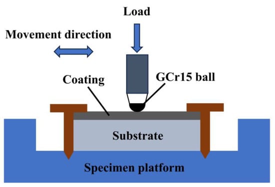 The microstructure of the fused cladding layer was examined using a LEICA DM2700M (Leica Instruments GmbH, Wetzler, Germany) optical microscope (OM) and a JSM-6490LV (JEOL Ltd., Akishima City, Tokyo, Japan) electron microscope (SEM). The elemental composition and content of the constituents in the fused cladding layer were determined through energy-dispersive spectroscopy (EDS) coupled with SEM. The physical phase analysis of the cladding was conducted using a Shimadzu XRD-6100 (Shimadzu Kyoto, Japan) X-ray diffractometer (XRD) with a Cu target, a tube voltage of 40 kV, a tube current of 300 mA, a scanning speed of 4°/min, a scanning angle step of 0.02°, and a diffraction angle scanning range of 20° to 90°. Microhardness testing was performed using an MH-500 digital microhardness tester with a 500 gf load and a 10 s loading time. To minimize measurement variability, hardness was tested at five positions at the same height below the coating surface, and the average value was recorded. Friction and wear tests were conducted at room temperature using an MGW-02 high-speed reciprocating fatigue friction and wear tester. The schematic diagram of the friction and wear setup is shown in Figure 4. GCr15 material with a diameter of 6.5 mm served as the grinding ball, and a loading force of 40 N was applied with an oscillation frequency of 5 Hz. The experiments were carried out for 20 min.