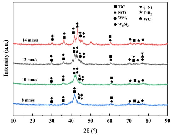 To analyze the physical phase composition of Ni60/WC composite coatings, XRD was used, and Figure 5 shows the XRD patterns of Ni60/WC-composite-coated surfaces at various speeds (8, 10, 12, and 14 mm/s). The composition of physical phases is similar at different scanning speeds. The physical phase primarily consists of hard phases TiC, TiB2, WC, and γ-Ni solid solution, along with intermetallic compounds NiTi, WSi2, and W5Si3. Owing to the elevated temperature in the melt pool, some of the WC can undergo dissolution, leading to matrix dilution within the melt pool. This results in the reaction within the melt pool to produce TiB2, NiTi, TiC, WSi2, W5Si3, and other phases [24]. XRD results demonstrated that the diffraction peaks of TiC and NiTi are stronger, indicating that TiC and NiTi are produced in the composite coating. Simultaneously, the diffraction peaks of WC can be observed, indicating that some of the composite coating still remains as dissolved WC particles.