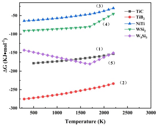 Based on the principles of thermodynamics, a negative change of Gibbs free energy (ΔG) suggests the chemical reaction could be completed spontaneously under that condition [26]. Figure 6 shows the Gibbs free energy–temperature curves, and the standard Gibbs free energies ΔG of TiC, TiB2, NiTi, W5Si3, and WSi2 are consistently below zero within the temperature range of 298~2200 K. This is similar to the results reported in the literature [27,28], which indicates that all of the above substances can be synthesized during the laser cladding process [29,30].