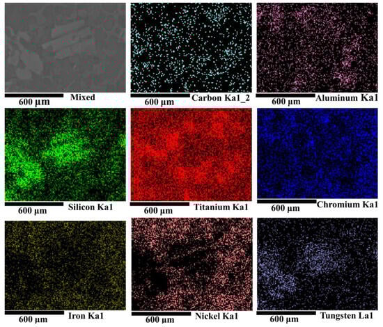 Figure 7 depicts the surface scanning results of the microstructure of the composite coating at a scanning speed of 12 mm/s. It can be observed that the large grayish-white irregular precipitates consist of elements W and Si, which can be identified as the compounds of WSi2 and W5Si3. Based on the Gibbs free energy and thermodynamic theories discussed earlier, it is easier to produce W5Si3 during equilibrium solidification, followed by the formation of WSi2. The superior hardness and unique chemistry of WSi2 and W5Si3 contribute to the enhanced hardness properties and improved wear resistance [31]. Apart from large gray-white irregular precipitates, the remaining areas primarily consist of Ni, Fe, Ti, and other elements, forming the γ-Ni solid solution. The distribution of Ti elements indicates their incorporation during laser melting.