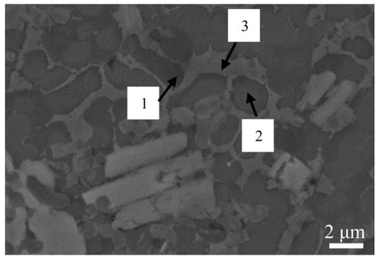 As shown in SEM images obtained with a scanning speed of 12 mm/s in Figure 8, large columnar and massive gray-white crystalline precipitates can be observed, which are primarily composed of the elements W and Si. This indicates the presence of the compounds WSi2 and W5Si3. The remaining is mainly composed of gray continuous matrix and bar-like and polygonal tissues. EDS analysis was performed on microregions 1, 2, and 3, as labeled in the figure, and the atomic percent content obtained is detailed in Table 4. In microregion 1, the dark gray matrix is rich with C, Ni, and Ti elements. These three microregions are mainly rich in C, Ni, and Ti elements, and the combination of XRD results shows that the three microregions are judged to be composed of TiC, NiTi, and r-Ni solid solutions.