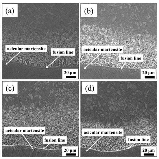The SEM images of the binding area of the Ni60/WC composite coating can be seen in Figure 9. A fusion line is evident at the junction of the bottom of the coating and the substrate. When the scanning speed increases, the fusion line becomes clearer and more distinct, indicating a robust bonding between the coating and the substrate [32]. The substrate and the powder diffuse with each other when affected by the action of the high-energy of laser beam, facilitating the formation of a strong metallurgical bond. Acicular martensite also appeared in the heat-affected zone at the bottom of the coating. This formation is attributed to the intensive heat generated by the high laser energy beam, resulting in rapid heating of the contact area with the substrate and a high cooling rate of 200 °C/s. The rapid cooling prompts the diffusion-free martensite transformation [33]. The acicular martensite growth direction is perpendicular to the fusion line because the optimal growth direction of crystal grains is in the same direction as the direction of heat dissipation, a phenomenon similar to the results of Zhu et al. [34]. It can be seen from the figure that there is a good metallurgical bonding between the powder and the substrate at different scanning speeds, and no obvious cracks are produced.