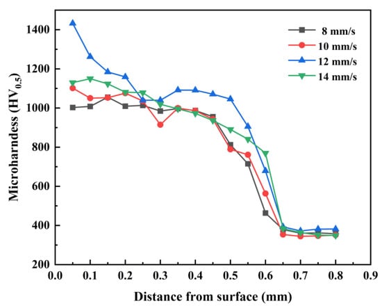 The microhardness of the fused-coated samples from the top to the substrate fabricated at various scanning speeds is depicted in Figure 11. It is evident that the microhardness of the fused-coated layer presents a higher value compared to the substrate (364.8 HV0.5). In the heat-affected zone at the interface, the microhardness of the coating experiences a drastic drop. Despite the generation of an acicular martensitic phase in the heat-affected zone, the microhardness is still higher than that of the matrix. The decrease in microhardness near the coating/substrate interface is greater due to dilution of the bottom of the coating by the substrate material. Meanwhile, the microhardness of the substrate area remains hardly changed. The average hardness of the fused cladding layer at scanning speeds of 8, 10, 12, and 14 mm/s were 1001.4 HV0.5, 1017.8 HV0.5, 1141.6 HV0.5, and 1037.7 HV0.5, respectively, indicating a 2.75–3.13 times increase compared to that of the substrate. Liu et al. [20] prepared a Ni60 + 50% WC coating on a Ti6Al4V substrate, and the hardness increased by 2.81 times. Feng et al. [35] prepared a (Ti3Al + TiB)/Ti composite coating, and the hardness was 2.31 times that of the substrate, which is lower than the hardness of the fused cladding layer in this paper. The microhardness of the fused-coated samples first increased and then decreased with the rise of the scanning speed, and the highest average hardness of the fused-coated layer was achieved when the scanning speed was set at 12 mm/s.
