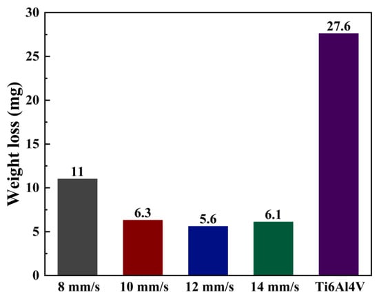 The amount of wear features one of the fundamental parameters reflecting the wear resistance of a material [46]. Based on Archard’s formula [47], the amount of wear is inversely proportional to the material’s hardness. Consequently, higher hardness implies better abrasion resistance. This result is like the findings of Mu et al. [48], who concluded that a lower coefficient of friction and higher surface microhardness can improve wear resistance. In this study, Figure 10 indicates that the microhardness of the composite coating is considerably improved when compared to the substrate material, with the highest microhardness achieved when 12 mm/s was set as the scanning speed. This implies that the wear resistance of the coating is superior to that of the substrate.