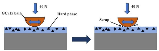 The friction and wear model of the Ni60/WC coating is given in Figure 15. The cladding process generates a substantial amount of heat, which causes part of the WC particles to dissolve and the substrate to dilute into the molten pool. This initiates reactions that produce TiC and TiB2 hard phases and W5Si3 and WSi2 silicides. These hard phases improve the hardness of the substrate, while the silicide can improve its toughness, thereby contributing to improved wear resistance. During the initial stage of the wear experiment, when the pair of grinding balls contacts the smooth coating surface, the friction coefficient is small. However, with an increase in friction time, the hard phases (TiC and TiB2) as well as the W5Si3 and WSi2 silicides and the WC particles inside the coating become exposed on the surface. These elements come into contact with the grinding ball, causing a cutting phenomenon and resulting in an obvious rise of the friction coefficient. As the wear between the ball and hard-phase particles increases, the hard-phase particles are fractured, resulting in the formation of abrasive debris and abrasive wear of the coating. Once the friction time accumulates to a certain point, the peaks of the fabricated coating surface smooth out, thus raising the surface’s contact area. Its wear process enters a stable stage, and the friction coefficient is stabilized with minimal fluctuation.