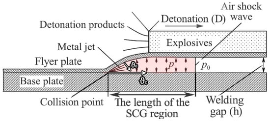It is well known that strength of the EW joint depends on the following parameters: detonation velocity (D), flyer plate velocity (0), welding gap (h), explosive mass ratio (r), surface finish of the initial materials, and the type of atmosphere in the welding gap (air or an inert gas) [14]. The collision of the plates forms a shock-compressed gas (SCG) and metal jet in the gap between the plates [15,16,17]. The SCG is limited on one side by the air shock wave front and on the other by the inclined surface of the flyer plate moving at collision point velocity [18]. The length of the SCG region (Figure 1) affects the quality of the weld joint and it increases in the EW process [19]. This increase is especially substantial in plates with widths of ≥0.5 m, because larger widths impede the outflow of SCG from the welding gap sideways [17]. This lengthening of the SCG region raises the temperature in the welding gap up to 3000 K [19], which leads to the heating of the welded surfaces and their local melting before the collision of the plates takes place [20]. All this must be taken into account when calculating the EW parameters, which also depend on the SCG parameters, such as velocity, pressure, and temperature.