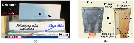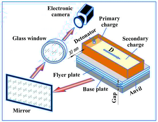 This camera was used in two experimental configurations. Configuration 1 is shown in Figure 4. The explosive charge consisted of a primary charge and a secondary charge. The primary charge is ammonite and the secondary charge is an ANFO 96:4 mixture of microporous ammonium nitrate with diesel oil (d = 780 kg/m3). To prevent the detonation products from blocking the view of the welding gap during the process of photography, the width of the explosive was made narrower than the width of the flyer plate. The direction of the photography process in both configurations is shown by the red arrow (Figure 5 and Figure 6).