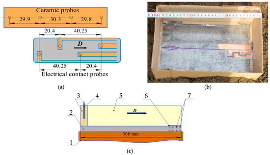 The measurement of the denotation velocity: (a) scheme of arrangement of probes; (b) photograph the steel plate with probes; (c) scheme of the assembly: 1—sand, 2—steel plate, 3—primary charge, 4—detonator, 5—secondary charge, 6—electrical contact probes, 7—ceramic probes.