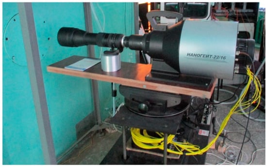 The NANOGATE-22/16 high-speed electronic camera (Nanoskan, Moscow, Russia) (Figure 4) allowed us to record a series of images of rapid processes in visible spectrum. This camera is an 8-channel system that consists of an entrance lens and a catadioptric-lens unit for dividing an image into eight channels. As a result, 16 recorded images appear on a computer monitor. The electronic camera allowed us to set the time between frames from 2 ns to 100 μs. In configuration 1, the time between frames is 3.125 μs, and in configuration 2 is 7.300 μs. The image resolution is 2128 × 2112 px.