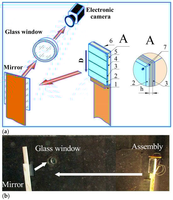 Configuration 2 for high-speed photography of SCG: (a) schematic diagram: 1—post; 2—base plate (acrylic glass); 3—flyer plate; 4—secondary charge; 5—primary charge; 6—detonator; 7—screw, (b) photograph of configuration 2.