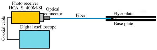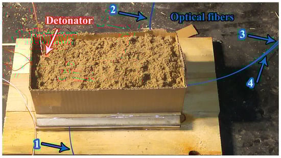 The scheme of the location of the optical fibers in the welding gap is shown in Figure 8. The optical fibers were attached by means of a glue to the base plate. Then, the flyer plate was placed and the explosive charge was extended over the flyer plate as in configuration 1. A layer of sand was placed on the explosive charge.