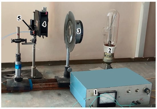Photograph of the scheme of calibration of silicon photodiodes: 1—current source; 2—tungsten filament lamp; 3—collecting lens; 4—chopper; 5—optic fiber holder.