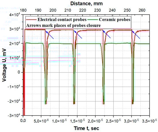 Figure 10 shows the oscillograms of the detonation wave profiles as a function of time. The drop in signal amplitude recorded by the digital oscilloscope corresponds to the moments when probes close. The average detonation velocity measured using electrical contact probes and ceramic probes was 2470 and 2440 m/s, respectively. The oscillograms show that the detonation velocity is constant along the length of the explosive charge.