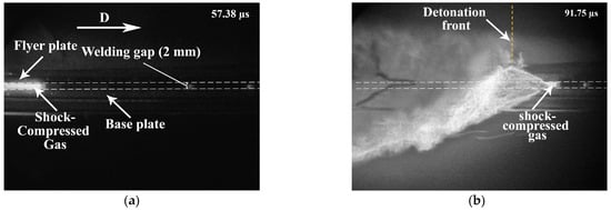 Figure 11 shows the images of the SCG region in the welding gap captured in configuration 1. It can be seen that the head part of the SCG is ahead of the detonation front (Figure 11b). The head front of the SCG region had a velocity of 3000 ± 100 m/s.