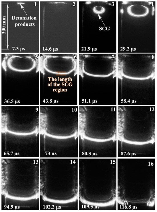 Figure 12 shows high-speed photography images of the SCG region captured in configuration 2. The first two images show glowing detonation products (Images 1 and 2). At this point in time, the flyer plate is still in the initial position. The elliptical SCG region around the initiation point was formed after collision (Image 3). As the contact point moved, the size of the elliptical SCG region increased (Images 4 and 5). As can be seen in Images 6–11, the SCG region flows out to the sides and takes on a linear shape. The velocity of the SCG region in the center was higher than the velocity of the peripheries. Then, these velocities become equal (Images 12–15). Image 16 shows the moment when the SCG region escapes into the atmosphere.