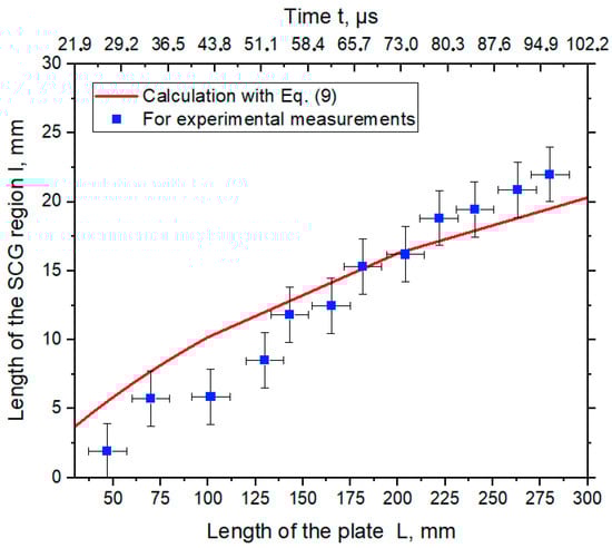 The results of the calculation according to Equation (9) showed that the length of the SCG region increased as the collision point moved (Figure 13, red curve), and at a distance of 300 mm it was about 20 mm. Measurement from the images showed that at a distance of about 275 mm, the length of the SCG region was about 22 mm.