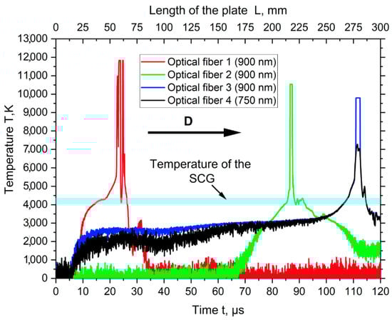 Figure 14 shows the oscillograms from the digital oscilloscope. Using the developed scheme for determining the location of maximum light collection (Figure 15), it was determined that the SCG temperature was 4100–4400 K (blue line). The peaks on the oscillograms are explained by the shock wave hitting the optical fiber.