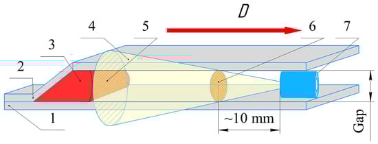 The scheme for determining the distance of maximum light collection from SCG region: 1—base plate; 2—flyer plate; 3—SCG region; 4—acceptance cone; 5—first field of view of the optical fibers; 6—second field; 7—optical fiber.