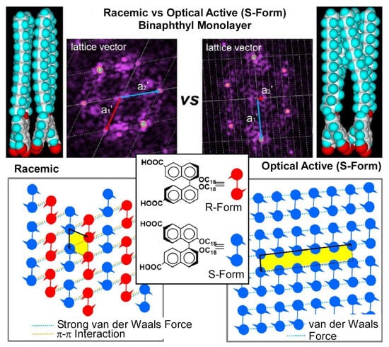 - Negi, S.; Hamori, M.; Kubo, Y.; Kitagishi, H.; Kano, K. Monolayer formation and chiral recognition of binaphthyl amphiphiles at the air–water interface. Bull. Chem. Soc. Jpn. 2023, 96, 48–56. [Google Scholar] [CrossRef]