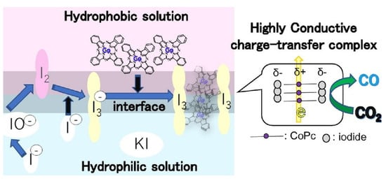 - Takase, S.; Aritsu, T.; Sakamoto, Y.; Sakuno, Y.; Shimizu, Y. Preparation of highly conductive phthalocyaninato-cobalt iodide at the interface between aqueous KI solution and organic solvent and catalytic properties for electrochemical reduction of CO2. Bull. Chem. Soc. Jpn. 2023, 96, 649–653. [Google Scholar] [CrossRef]