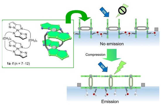 - Adachi, J.; Mori, T.; Inoue, R.; Naito, M.; Ngoc Le, N.H.-T.; Kawamorita, S.; Hill, J.P.; Naota, T.; Ariga, K. Emission control by molecular manipulation of double-paddled binuclear PtII complexes at the air-water interface. Chem. Asian J. 2020, 15, 406–414. [Google Scholar] [CrossRef] [PubMed]