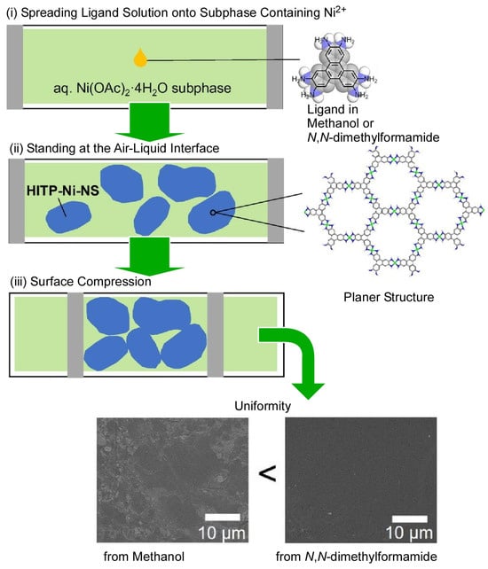 - Ohata, T.; Tachimoto, K.; Takeno, K.J.; Nomoto, A.; Watanabe, T.; Hirosawa, I.; Makiura, R. Influence of the solvent on the assembly of Ni3(hexaiminotriphenylene)2 metal–organic framework nanosheets at the air/liquid interface. Bull. Chem. Soc. Jpn. 2023, 96, 274–282. [Google Scholar] [CrossRef]