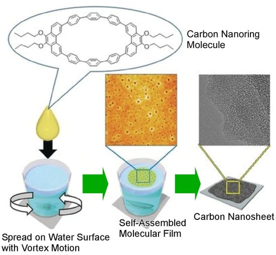 - Mori, T.; Tanaka, H.; Dalui, A.; Mitoma, N.; Suzuki, K.; Matsumoto, M.; Aggarwal, N.; Patnaik, A.; Acharya, S.; Shrestha, L.K.; et al. Carbon nanosheets by morphology-retained carbonization of two-dimensional assembled anisotropic carbon nanorings. Angew. Chem. Int. Ed. 2018, 57, 9679–9683. [Google Scholar] [CrossRef] [PubMed]