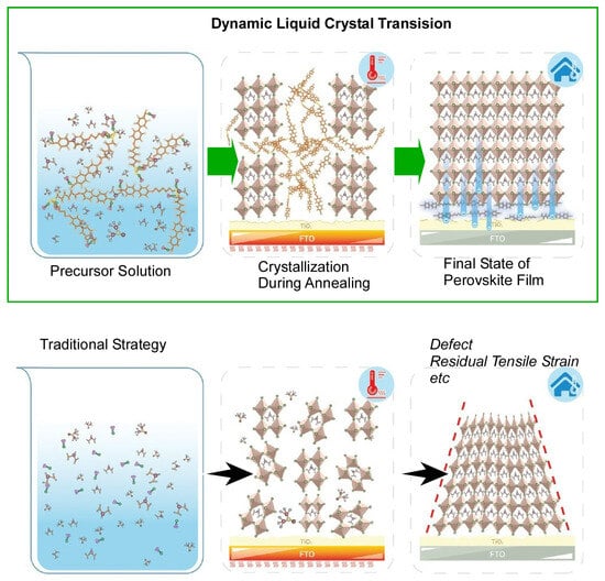 - Du, X.; Zhang, L.; Chen, R.; You, J.; Ma, Y.; Wang, J.; Wu, Y.; Liu, B.; Zhao, K.; Chen, J.; et al. Spontaneous interface healing by a dynamic liquid-crystal transition for high-performance perovskite solar cells. Adv. Mater. 2022, 34, 2207362. [Google Scholar] [CrossRef] [PubMed]