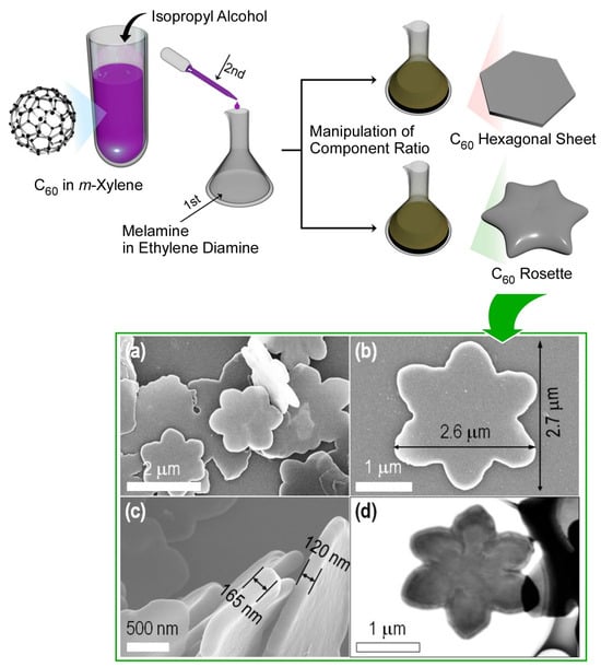 - Sathish, M.; Miyazawa, K. Size-tunable hexagonal fullerene (C60) nanosheets at the liquid−liquid interface. J. Am. Chem. Soc. 2007, 129, 13816–13817. [Google Scholar] [CrossRef]