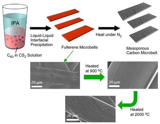 - Tang, Q.; Bairi, P.; Shrestha, R.G.; Hill, J.P.; Ariga, K.; Zeng, H.; Ji, Q.; Shrestha, L.K. Quasi 2D mesoporous carbon microbelts derived from fullerene crystals as an electrode material for electrochemical supercapacitors. ACS Appl. Mater. Interfaces 2017, 9, 44458–44465. [Google Scholar] [CrossRef] [PubMed]
