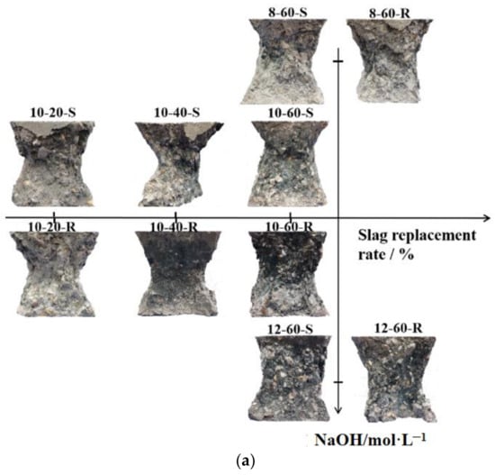 The failure patterns of specimens with different slag replacement ratios and alkali activator concentrations are shown in Figure 4. The horizontal axis in Figure 4a denotes the variation in the slag replacement ratio, while the vertical axis represents the variation in the NaOH solution concentration. As displayed in Figure 4b, with the increasing molarity of the NaOH solution and the slag replacement rate, more broken recycled coarse aggregates, represented by the white color, are observed on the failure surface. Moreover, the increasing molarity of the NaOH solution results in the failure surface turning from light gray to black. It can be observed that with the increase in the NaOH solution molarity, the failure pattern demonstrates more RCAs being fractured rather than interface debonding between the matrix and aggregates. The increasing molarity of the NaOH solution accelerates the dissolution of silicon and aluminum ions from the slag and fly ash. Simultaneously, this leads to the increase in Na+ ions in the solution, which is the key element for the geopolymerization process. The sufficient number of ions is helpful in combining it with the N-A-S-H gel product, contributing to the material’s early strength. This can explain how the NaOH solution concentration helps improve the bonding strength of the geopolymer binders. Through the vertical axis, it can be observed that the color of the failure surface turns dark with the increase in NaOH solution concentration. Alkali-activated concrete commonly exhibits a dark color. A certain amount of white unactivated powder is detected on the fractured surface of the 8-60-S specimen with an 8 mol/L NaOH solution concentration. This can be attributed to the fact that a high NaOH solution concentration can accelerate the speed of the activation process of fly ash and slag.