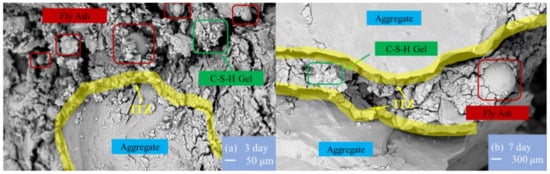 The Scanning Electron Microscope (SEM) was also used to analyze the microstructure. Figure 5 presents the results of the microstructural observation of the geopolymer concrete with sea sand at different curing ages. As shown in Figure 5a, for the specimen with a curing age of 3 days, there are some partially reacted and unreacted fly ash particles remaining on the surface, while the C-S-H gel, regarded as an unstable microstructure, is visible on a significant proportion of the surface. Utilizing the SEM also revealed a small portion of C-(A)-S-H gel acting as a stable structural product, which was formed by the chemical reaction between the fly ash, slag, and C-S-H gel. There were numerous discrete microcracks observed in the C-S-H gel paste, resulting in poor bonding behavior. These reasons explain the reduction in compressive strength for the sea sand geopolymer concrete at an early stage. As shown in Figure 5b–d, since the fly ash particles were rarely observed, the alkaline activation reaction was almost completed. Subsequently, the free Al(OH)4− group in the polymer’s internal system reacts with the C-S-H gel to produce a stable C-(A)-S-H gel microstructure in the later hydration stage. The final product exhibits a dense structure, and this explains why the compressive strength of the SSGRC increases as the curing age increases. As shown in Figure 5, compared to the specimen after 7 days, 14 days, and 28 days, the specimen at the curing age of 3 days has more visible microcracks and fly ash particles scattered across the concrete. This means that the geopolymerization reaction is still continuing, and the fly ash exhibits a spherical particle form. As the number of curing days increases, a reduction in fly ash is observed and more C-(A)-S-H gel filling the microcracks is produced, resulting in a dense microstructure. For the curing ages of 14 and 28 days, the hydration process is more mature and the sample appears free of voids. The main cracks along the interface transition zone (ITZ) of the aggregate for the specimen after 7 days of curing are more apparent than those after 14 and 28 days of curing. The specimen after 28 days of curing shows almost no unreacted fly ash, and cracks are mainly observed in the geopolymer paste instead of along the ITZ. The geopolymer exhibits a favorable bonding performance between the paste and the RCAs.