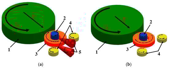 Diagram of the rolling method: (a) radial-axial, (b) radial; 1—main roll, 2—mandrel, 3—rolled ring, 4—guide rolls, and 5—conical rolls.