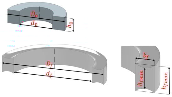 Diagram of the cross-section of the ring before and after the rolling process; h0, D0, d0—initial height, outer diameter and internal diameter of the preform, Df, df, bf—final outer diameter, internal diameter and thickness of the ring, hfmax—final maximum height of the ring and hfmin—final minimum height of the ring.