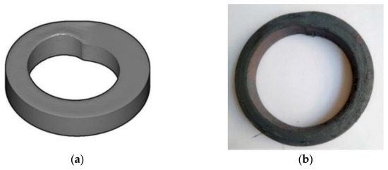 Defective rings obtained in a process carried out with a rotational speed of n1 = 60 rpm and the feed speed of the main roll V1 = 35 mm/s: (a) theoretical analysis and (b) experiment.