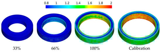 The average height hfa, the external diameter Df, and internal diameter df of the finished ring depending on the feed speed and the coefficient k determined by Equation (7) are shown in Table 4. The results indicated that the axial flow of the material is greater in the simulations than in the experiment. The theoretical height is significantly higher than the experimental height, therefore, the theoretical diameters are smaller than those obtained in the experiment. For each case, the percentage relative error E was calculated from the dependence: