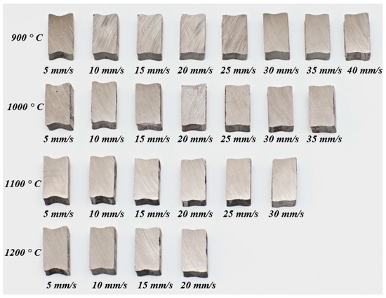 The cross-sections of forgings obtained in experimental tests for individual temperature and speed conditions are shown in Figure 6. The outer diameter Df and internal diameter df were measured in all rings (in four planes and the results were averaged) as well as the highest hfmax and the smallest hfmin cross-sectional height. The average cross-sectional height of the ring hfa was calculated according to Formula (4). Based on the measurements, the widening coefficient α and fishtail coefficient β were calculated.