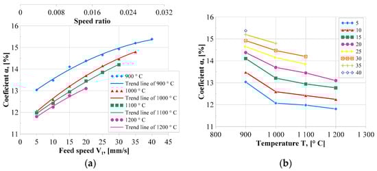 Coefficient α as a function of the V1 feed speed of the main roll and speed coefficient k (a) and coefficient α as a function of the initial temperature of the preform (b).