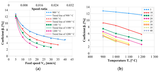 The influence of temperature on the β coefficient (Figure 8b) generally demonstrates a decreasing trend, that is, the higher the temperature, the smaller the β coefficient. The intensity of this dependence devolves on the speed parameters. For the V1 = 5 mm/s, the influence of temperature is almost imperceptible, the β coefficient ranges from 11.6% to 12.8%. For larger values of the feed speed V1, the differences in the β coefficient are more pronounced and have smaller values for higher temperatures. Based on the results obtained, it can be concluded that in terms of cross-section distortion (fishtail defect), it is beneficial to heat the preform to higher temperatures.