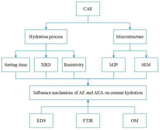 The influence of AE and AEA types on the cement hydration process was studied from the perspective of macroscopic properties, hydration product formation, and ion dissolution through setting time tests, XRD, and resistivity tests. The influence of AE and AEA types on the microstructure of cement paste was studied through MIP results and SEM results. Based on the EDS elemental spectrum of cement pastes, Fourier transform infrared spectroscopy of two emulsifiers, and optical microscopy images of CAE, the influence mechanism of AEs and AEA on cement hydration process was analyzed. The experimental process is shown in Figure 1.