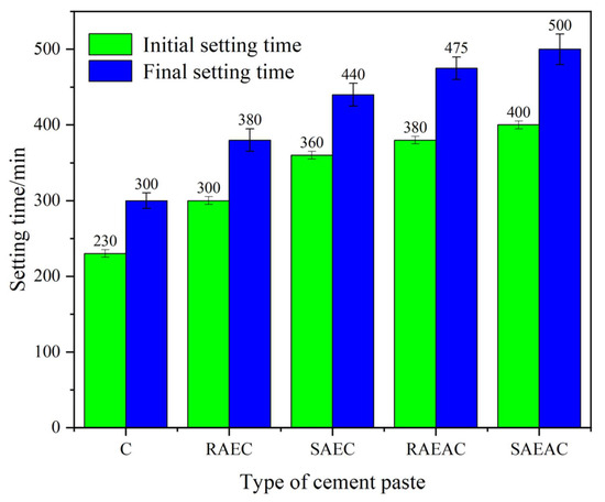 From the setting time test results, the initial setting times of the RAEC, SAEC, RAEAC, and SAEAC pastes increased by 30.4%, 56.5%, 43.5%, and 73.9% compared with those for C, respectively. The final setting times increased by 26.7%, 46.7%, 58.3%, and 66.7% compared with those of the C paste, respectively. Both AEs and AEA delayed the hydration process of the cement, and AEA had a stronger retarding effect on the cement. This was because the AE was a surfactant, meaning its active groups could adsorb onto the surface of cement particles, changing the surface charge properties of cement particles, increasing the repulsive force between cement particles, and thus slowing down the coagulation speed of cement particles. The influence of AEA on the hydration process of cement was mainly due to the fact that AEA droplets firstly aggregated on the surface of cement particles and compressed to form a layer of asphalt film, which hindered the hydration reaction of cement and prolonged the setting time. This indicated that both emulsifiers and asphalt components hindered the hydration of the cement. Figure 2 also shows that in comparing the effects of AEs and AEA with different demulsification rates on the cement setting times, RAEs and RAEA had a smaller impact on the hydration process of the cement paste, while SAEs and SAEA had a greater delaying effect on the hydration process of the cement paste.