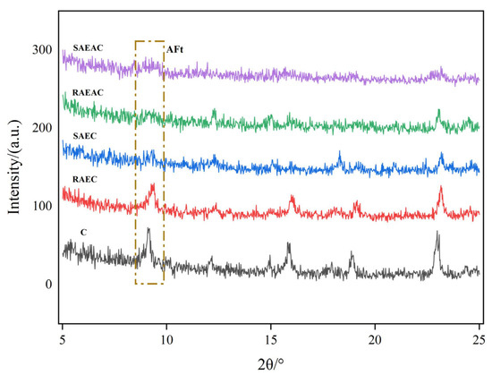 The ettringite generated during hydration of the cement paste showed a peak at a 2θ of approximately 8° [20]. Figure 3 shows that SAEC, RAEAC, and SAEAC did not exhibit peaks for ettringite. Both C and RAEC showed peaks corresponding to different contents of ettringite, and the intensity of the characteristic peak for C was slightly higher than that for RAEC. This indicated that after 4 h of hydration, SAEC, RAEAC, and SAEAC had not generated enough ettringite. Large amounts of ettringite were generated in C and RAEC, and the amount of ettringite generated in C was higher than that in RAEC.