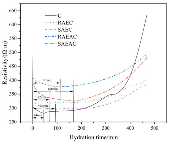 At the same time, the early resistivity of the cement paste mixed with AEs and AEA was higher than that of pure cement paste. The resistivities of RAEC, SAEC, RAEAC, and SAEAC decreased continuously for approximately 72 min, 92 min, 115 min, and 168 min, while the electrical resistivity of C decreased for approximately 44 min. Compared with pure cement paste, AEs and AEA delayed the time when cement hydration entered the formation period of hydration products because AEs and AEA were adsorbed on the surfaces of the cement particles, which inhibited the ion release generated by cement hydration, leading to an ion concentration lower than that of pure cement. Hence, the resistivities of cement pastes with AEs and AEA were higher than that of pure cement paste. Additionally, the continuous decrease in the resistivity of the SAEC lasted 20 min longer than that of the RAEC cement, and the continuous decrease in the resistivity of SAEAC lasted 53 min longer than that of the RAEAC cement. This occurred because more emulsifier was adsorbed onto the cement particles in SAEC and SAEAC.