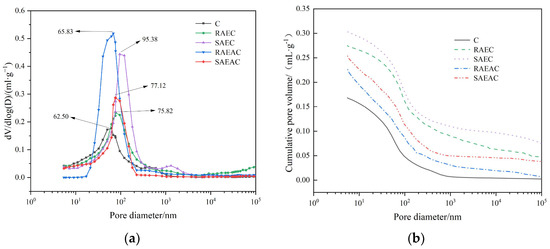 As shown in Figure 5a, the pore size distributions in all five groups of cement had peaks, and the pore size corresponding to this peak was the most probable aperture [24]. This indicates that within this aperture range, the proportion and probability of this aperture were the highest [25]. The most probable apertures for RAEC, SAEC, RAEAC, and SAEAC were 62.50 nm, 75.82 nm, 95.38 nm, 68.53 nm, and 77.12 nm, respectively. Figure 5b shows that the cumulative pore volumes of cement pastes increased in the order C, RAEAC, SAEAC, RAEC, and SAEC. Because the pores in the cement paste came from the original flushing space, which was not filled with hydration products, the differences in porosity and pore volumes for each group of cement were mainly attributed to inconsistent hydration of the cement.