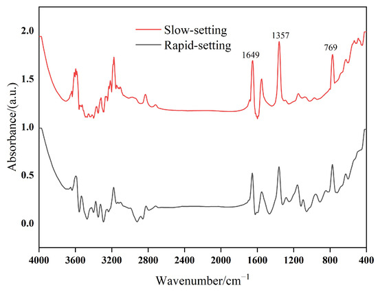 A Fourier infrared spectrometer (Vertex70, Karlsruhe, Germany) was used to conduct an infrared test on the rapid-setting emulsifier and slow-setting emulsifier according to the KBr tablet-pressing method, and the retarding mechanism of different emulsifiers on cement paste was explored based on the characteristic peaks of functional groups.